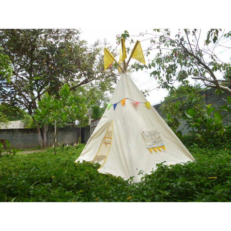 This Medium sized Tee Pee is suitable for both indoor and outdoor use. Made from raw cotton canvas and comes with 4 smooth finished wooden poles that can be dismantled for easy storage. Designed to fit into any decor, also included is rainbow colored flag bunting, and decorated window panels.